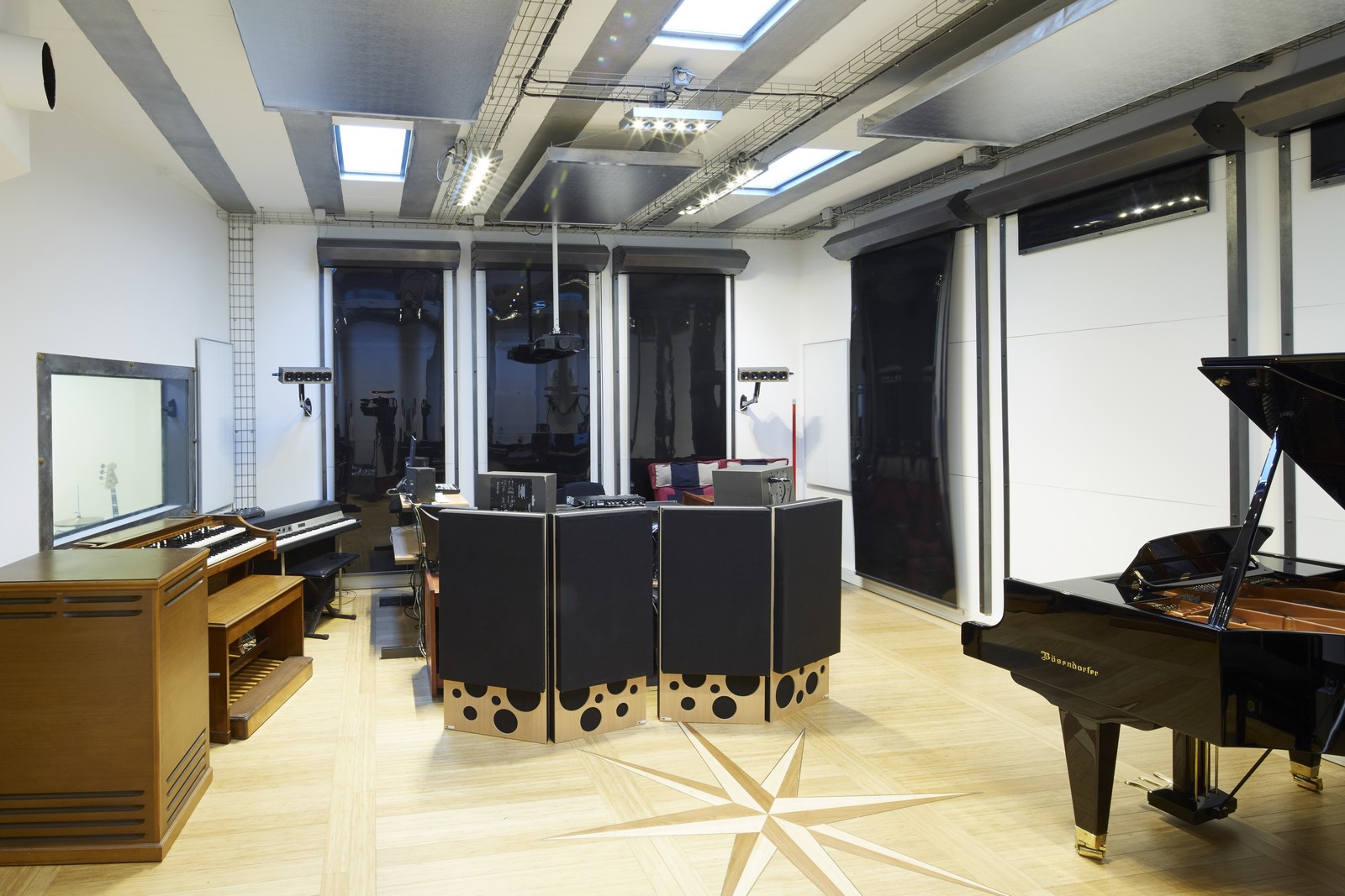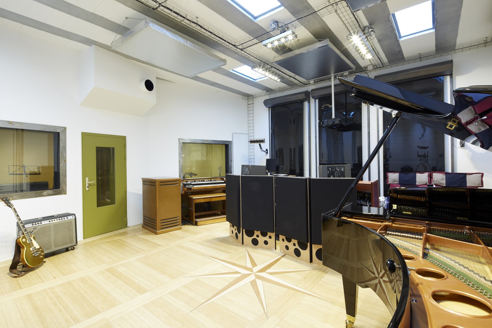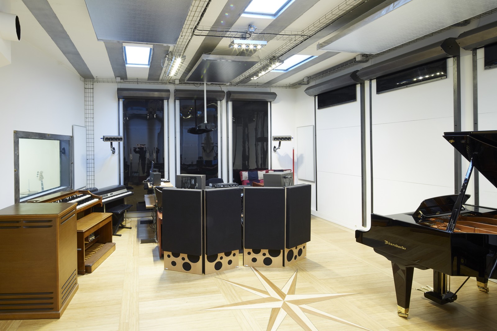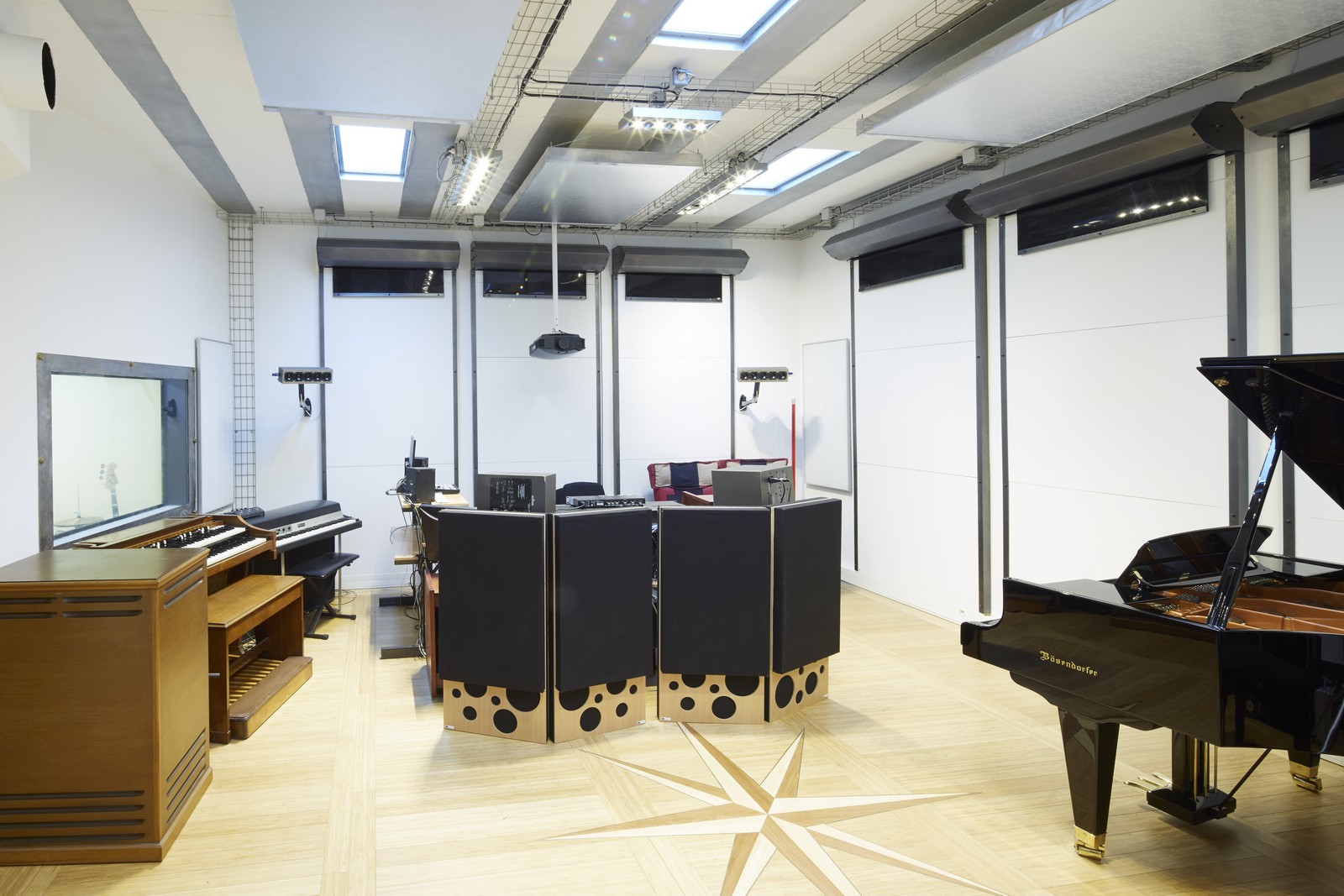 Une entrée de 9m2 qui sert aussi pour la prise de son, reliée a une cabine de 9m2 utilisée le plus souvent pour la batterie et une salle de 48m2 et 3,5m de hauteur qui sert de sale principale pour les prises de son et qui contient la régie enregistrement, l’écran de projection et le système de diffusion 5.1. La lumière du jour arrive par 5 skydomes. L’acoustique est traitée par des matériaux absorbants sur les surfaces murales. Des panneaux réverbérants modulables par télécommande peuvent recouvrir les absorbants ce qui permet une gestion de l’acoustique du lieu permettant différents types de prises de son.